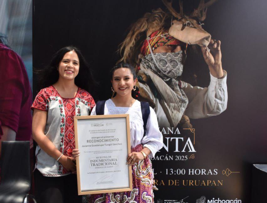 Uruapan, Michoacán.- El Gobierno de Michoacán, a través de su Secretaría de Cultura, realizó la Muestra de Indumentaria Tradicional 2025 con la participación de representantes de las subregiones culturales otomí, mazahua, purépecha y de la costa. En este marco se entregó un reconocimiento a Jovanna Guadalupe Tungüi Sánchez y al Colectivo Juiaje Kurpintani por su labor en la preservación de la indumentaria tradicional.