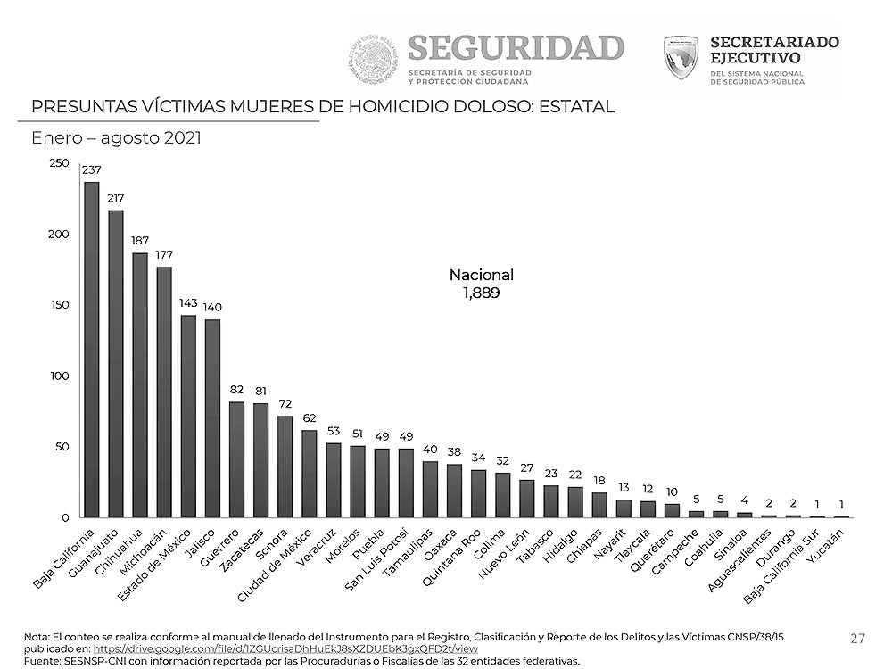 De enero a agosto de 2021 se registraron 177 mujeres víctimas de homicidio doloso, lo que ubica a Michoacán en el lugar número cuatro del país (en todo México hay 1 mil 887 casos). Sólo detrás de Baja California, Guanajuato y Chihuahua.