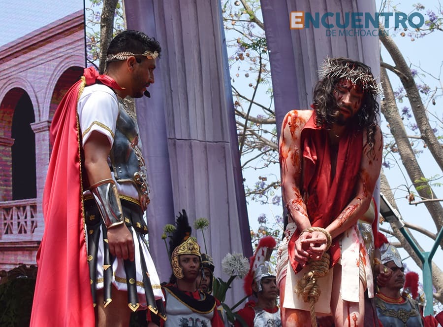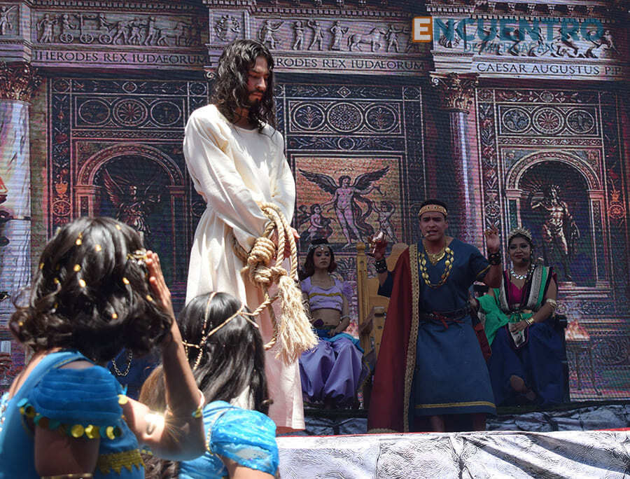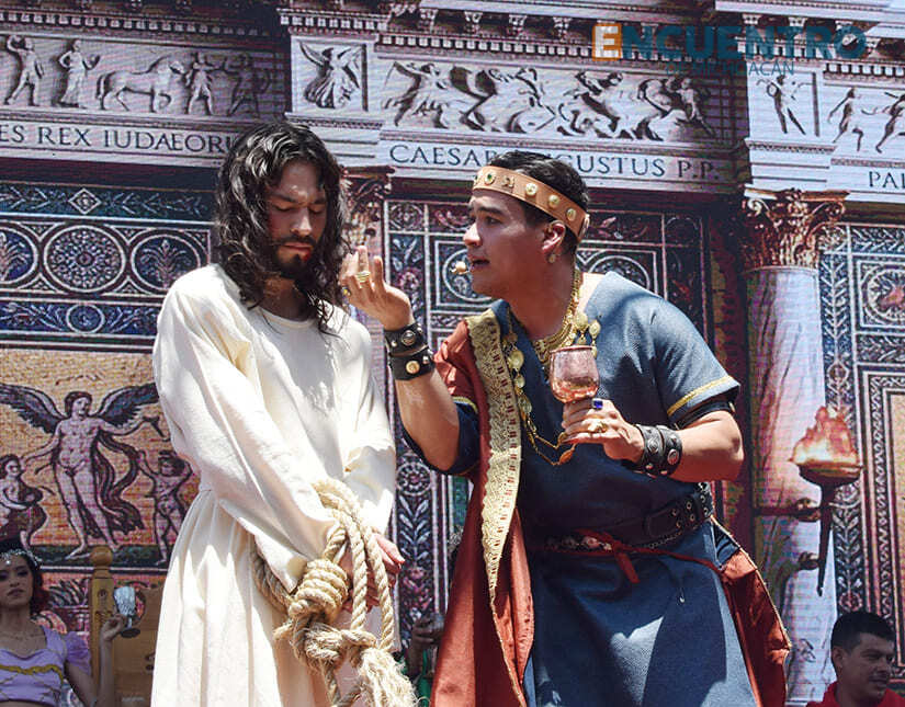 Este año también cautivó la escenografía de fondo en el escenario que dio una pantalla monumental, con la ambientación para las diferentes escenas como las presentaciones del nazareno ante Poncio Pilatos y Herodes Antipas, así como la proyección de los azotes al llamado rey de los judíos.