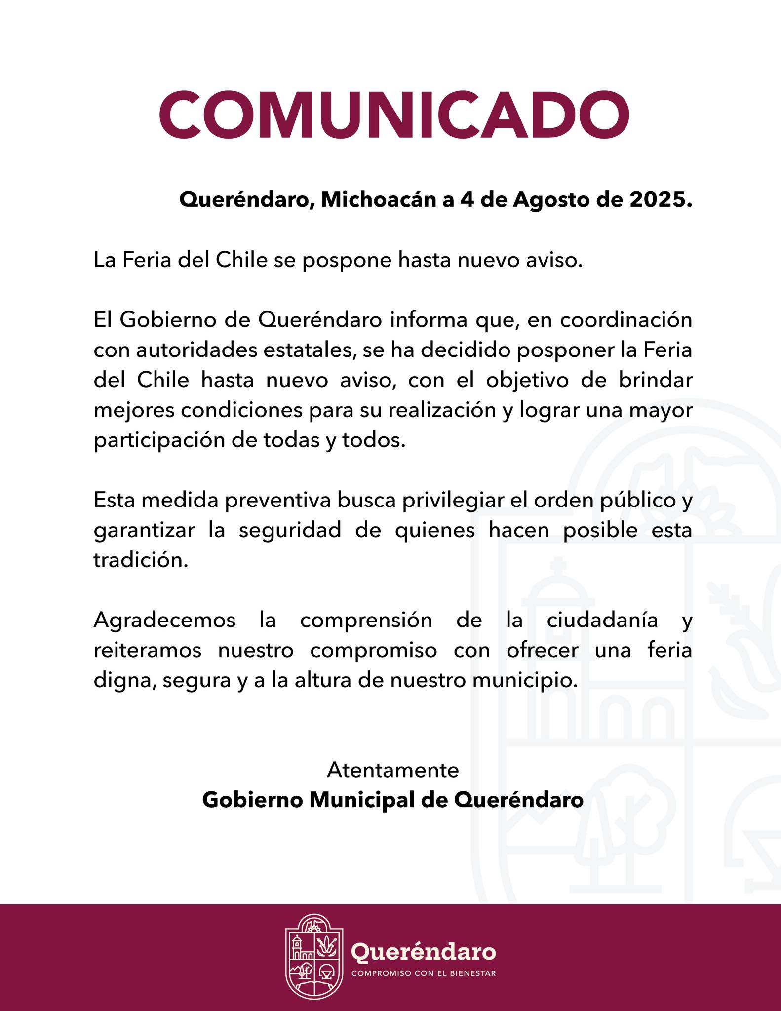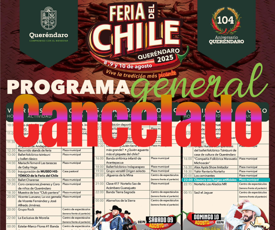 La Secretaría de Gobierno de Michoacán informó de manera oficial la suspensión de la Feria del Chile en el municipio de Queréndaro.