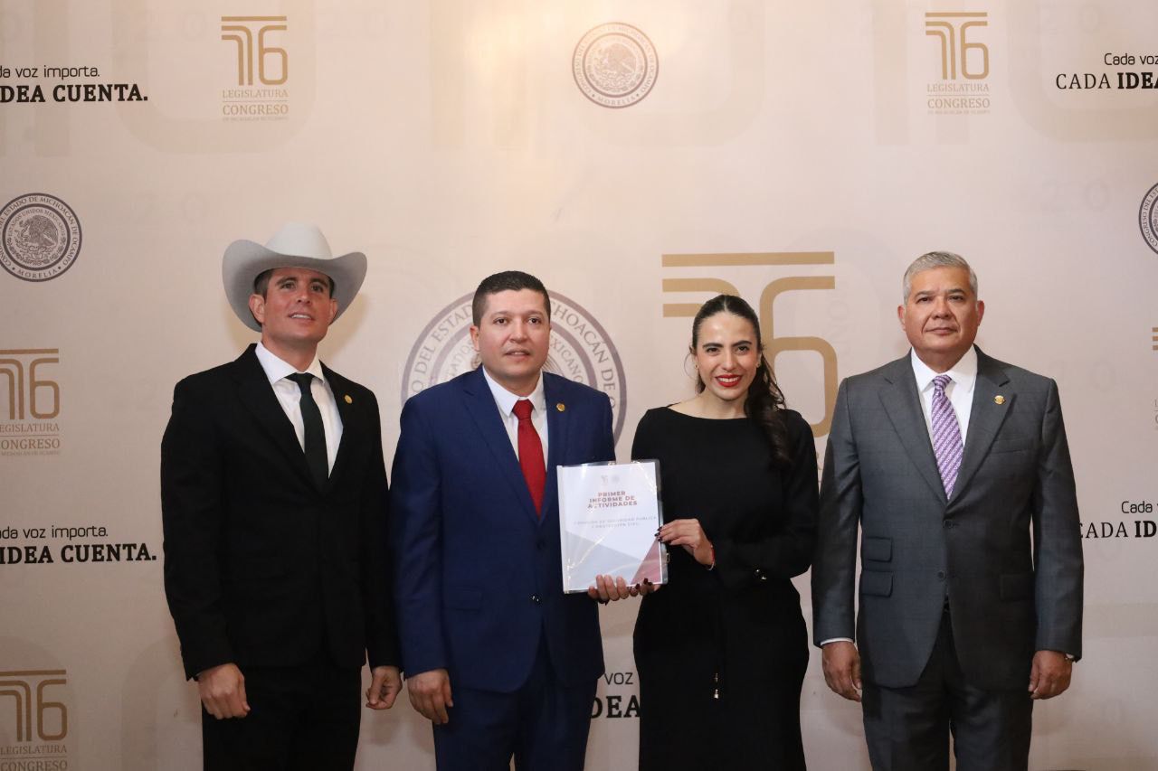Acompañado de los legisladores Juan Antonio Magaña de la Mora y Carlos Alejando Bautista Tafolla, el legislador por el Distrito XIX con sede en Tacámbaro, hizo entrega del documento que contiene las acciones realizadas por parte de esa Comisión, a la diputada presidenta de la Mesa Directiva de la LXXVI Legislatura del Congreso de Michoacán, Giulianna Bugarini Torres.
