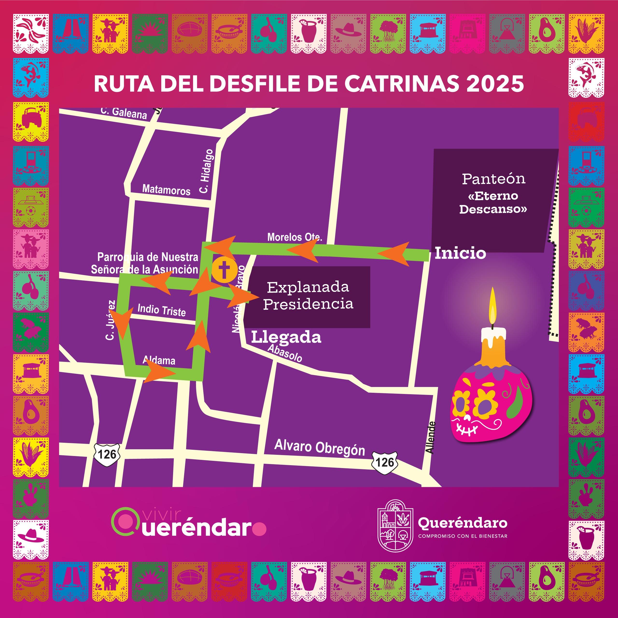Uno de los momentos más esperados será el Desfile Simbólico de Catrinas, que partirá desde el panteón “Eterno Descanso” rumbo a la Presidencia Municipal, uniendo a familias, escuelas e instituciones en un recorrido lleno de color, música y tradición.