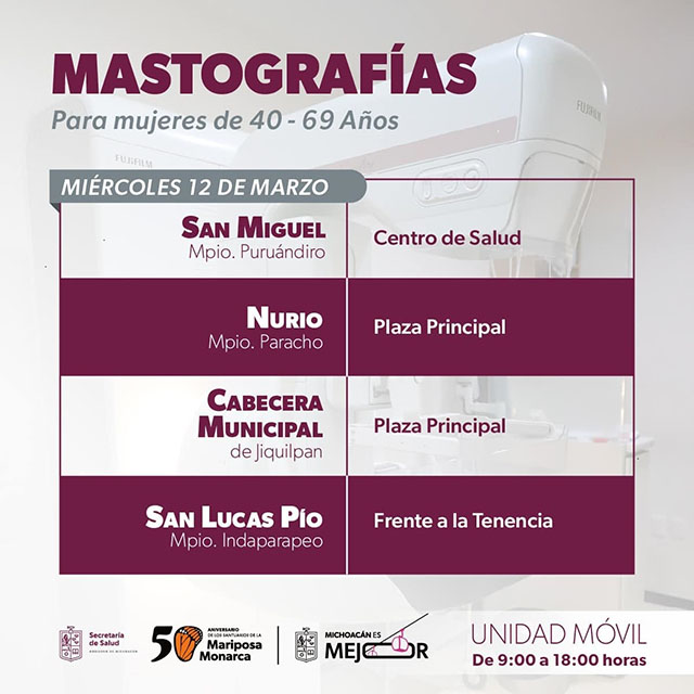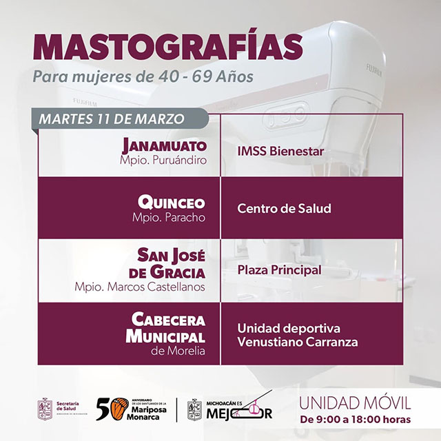 En Puruándiro, el gobierno municipal de Víctor Vázquez informó que la Unidad Móvil de Mastografía se ubicó este lunes 10 de marzo en las instalaciones del Centro de Salud de Villachuato y a lo largo de la semana las mujeres del municipio podrán realizarse su estudio en la unidad que estará en varias localidades como en Janamuato donde se instalará este martes 11 de marzo en las instalaciones del IMSS Bienestar.