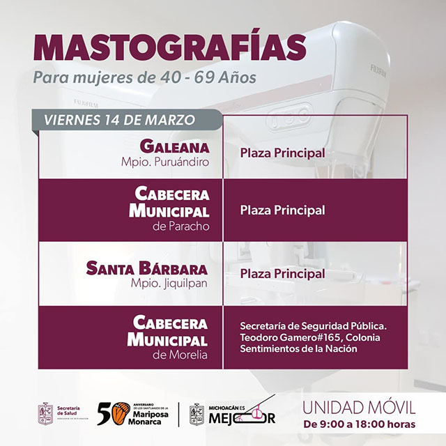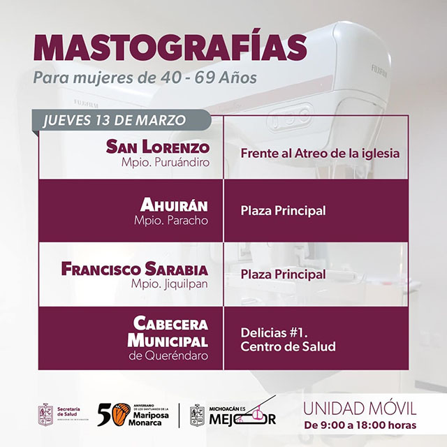 El jueves 13 de marzo, el mastógrafo de la Secretaría de Salud de Michoacán estará ubicado en la comunidad de San Lorenzo, frente al atrio de la iglesia y el viernes 14 de marzo estará en la localidad de Galeana, en las instalaciones de la plaza principal.