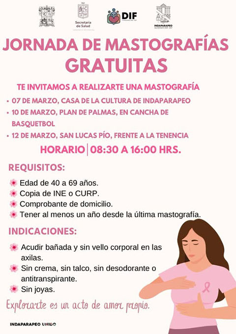 Gracias al apoyo de la Secretaría de Salud de Michoacán, a través del Dr. Héctor Morales Villa Jefe de la Jurisdicción Sanitaria No. 1 y de la gestión de la Centro de Salud de Indaparapeo, Dra. Vianey Alanís Reyes, el gobierno municipal que encabeza Janitzio Zavala pudo acercar las mastografías gratuitas y la semana pasada se instaló el mastógrafo en la Casa de la Cultura de Indaparapeo, mientras que este miércoles 12 de marzo se ubicará en la comunidad de San Lucas Pío, frente a las oficinas de la tenencia, por lo que se pide a las mujeres del municipio agendar su cita desde ahora.
