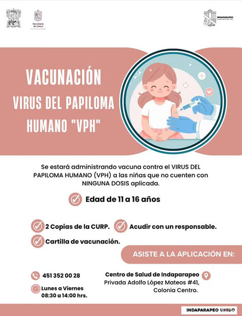 Además, en Indaparapeo, en el Centro de Salud ubicado en la Privada Adolfo López Mateos #41 se aplica actualmente la vacuna contra el Virus del Papiloma Humano (VPH) a jovencitas de 11 a 16 años de edad y sólo se piden 2 copias de la CURP; Cartilla de Vacunación; y acudir con padre de familia o tutor del menor.