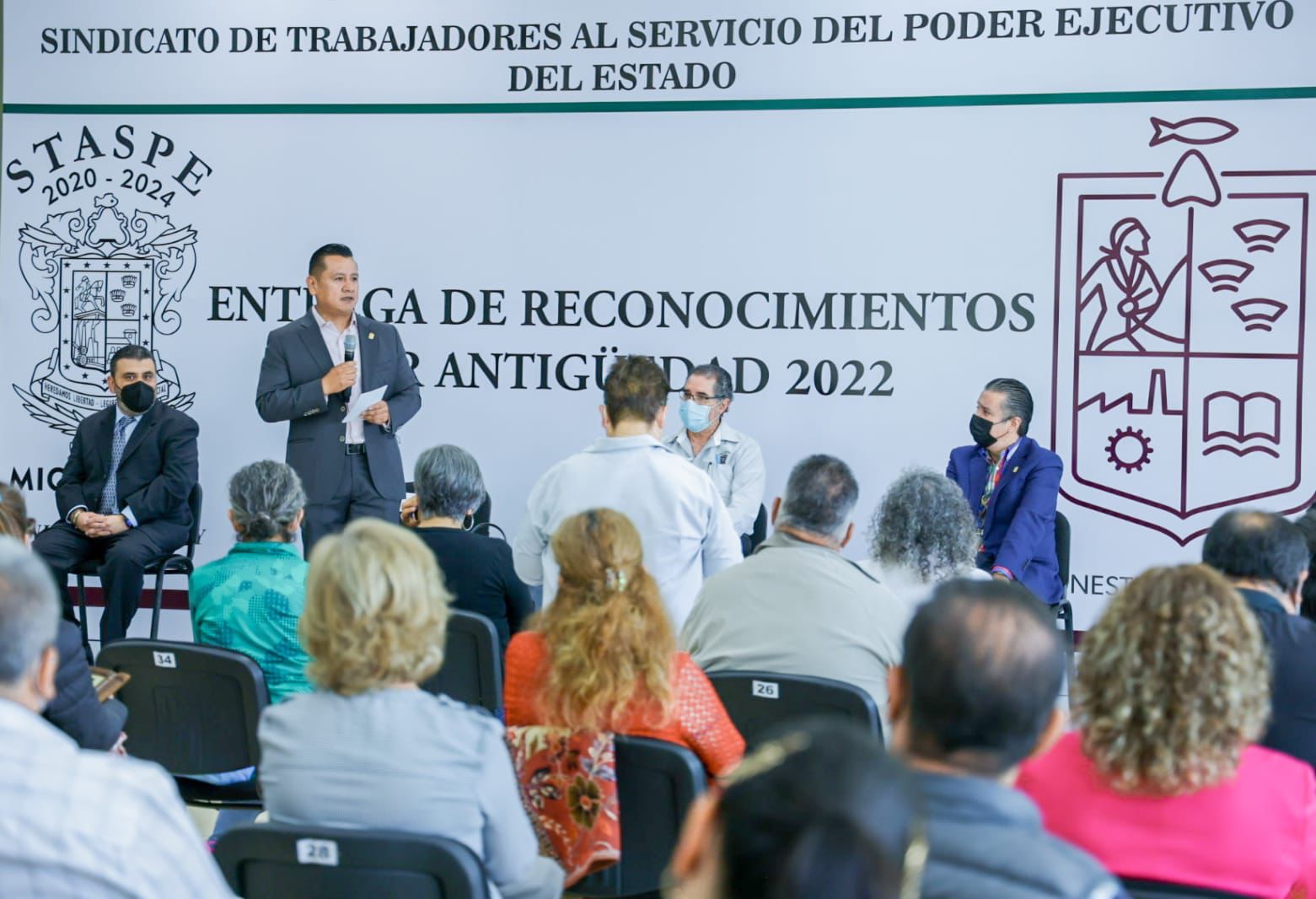 Luego de transmitir el saludo y felicitación del gobernador del Estado, Alfredo Ramírez Bedolla, el encargado de la política interna se dirigió a las y a los agremiados del Sindicato de Trabajadores al Servicio del Poder Ejecutivo (STASPE) para reconocerlos por su entrega y dedicación en sus respectivas tareas y funciones.