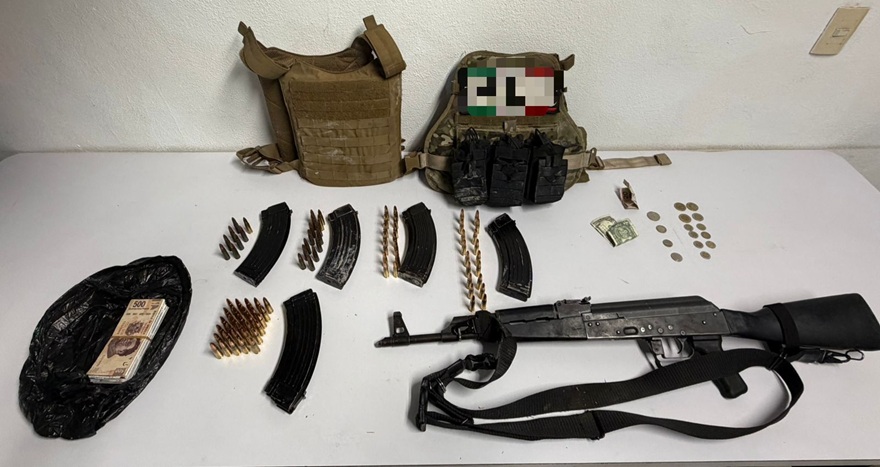 En el lugar, fueron detenidos en flagrancia dos hombres; además, fue asegurado un adolescente. A los implicados les fue decomisado un fusil calibre 7.62×39, 84 cartuchos útiles, cinco cargadores y dos chalecos tácticos con una leyenda alusiva a un grupo delictivo.