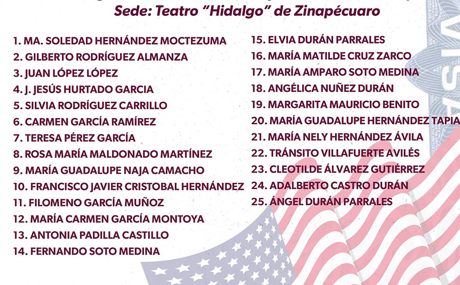 En el anterior paquete de visas realizado apenas el mes anterior, había resultado beneficiado un grupo de 19 adultos mayores, procedentes de las comunidades de José María Morelos, Estación Queréndaro, Jeráhuaro, Ucareo, Simirao, La Yerbabuena, Araró y también de la cabecera municipal de Zinapécuaro.