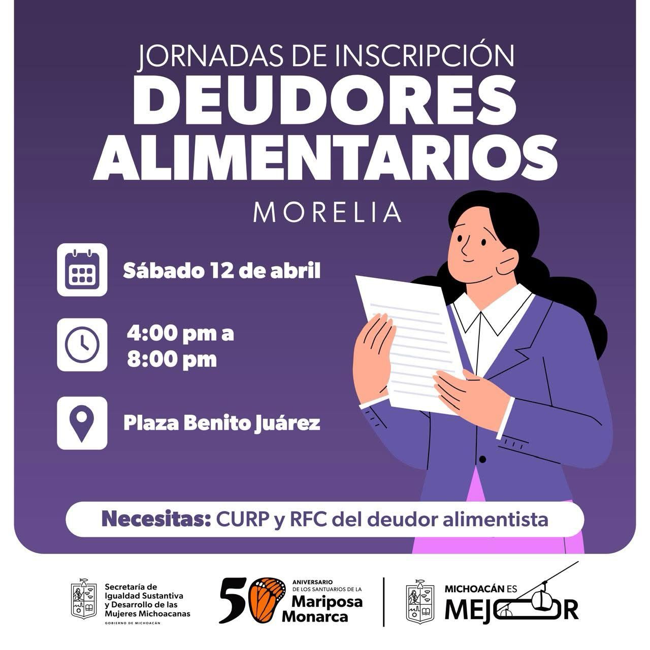 La Secretaría de Igualdad Sustantiva y Desarrollo de las Mujeres Michoacanas (Seimujer), encabezada por Alejandra Anguiano González, invita a la jornada de asesoría e inscripción de personas deudoras alimentarias al Registro Nacional de Obligaciones Alimentarias (RNOA), este sábado 12 de abril de 4:00 a 8:00 p.m. en la plaza Benito Juárez, en el Centro Histórico de Morelia.