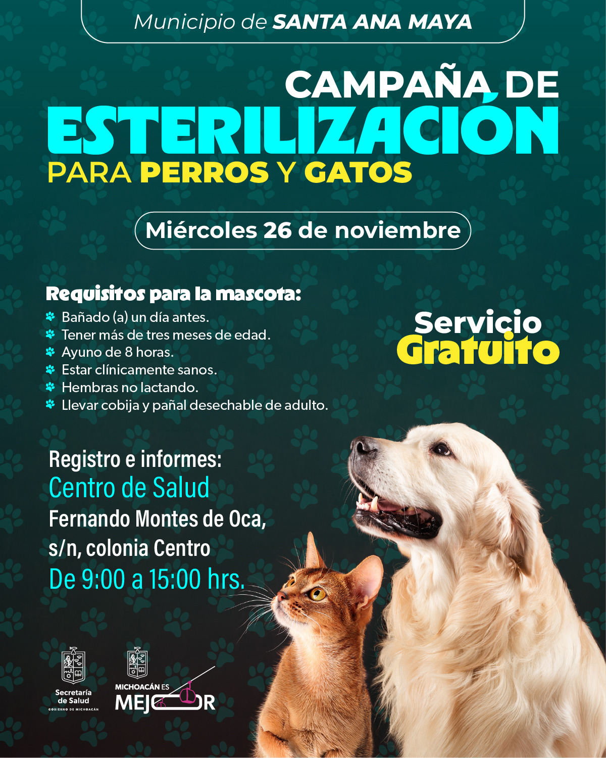 Comprometidos con el bienestar animal y el control poblacional de perros y gatos, la Secretaría de Salud de Michoacán (SSM) anuncia la realización de dos jornadas de esterilización gratuitas en los municipios de Uruapan y Santa Ana Maya.