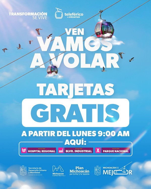 “Como se anunció con antelación, en próximos días iniciaremos con la entrega de tarjetas gratis para que todas y todos los uruapenses tengan la oportunidad de vivir la aventura de viajar en el teleférico”, subrayó.