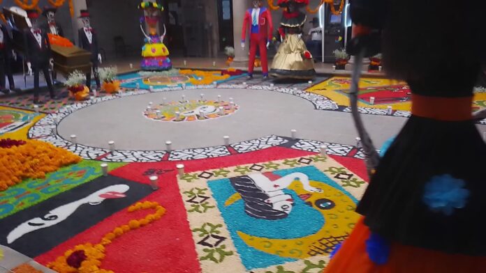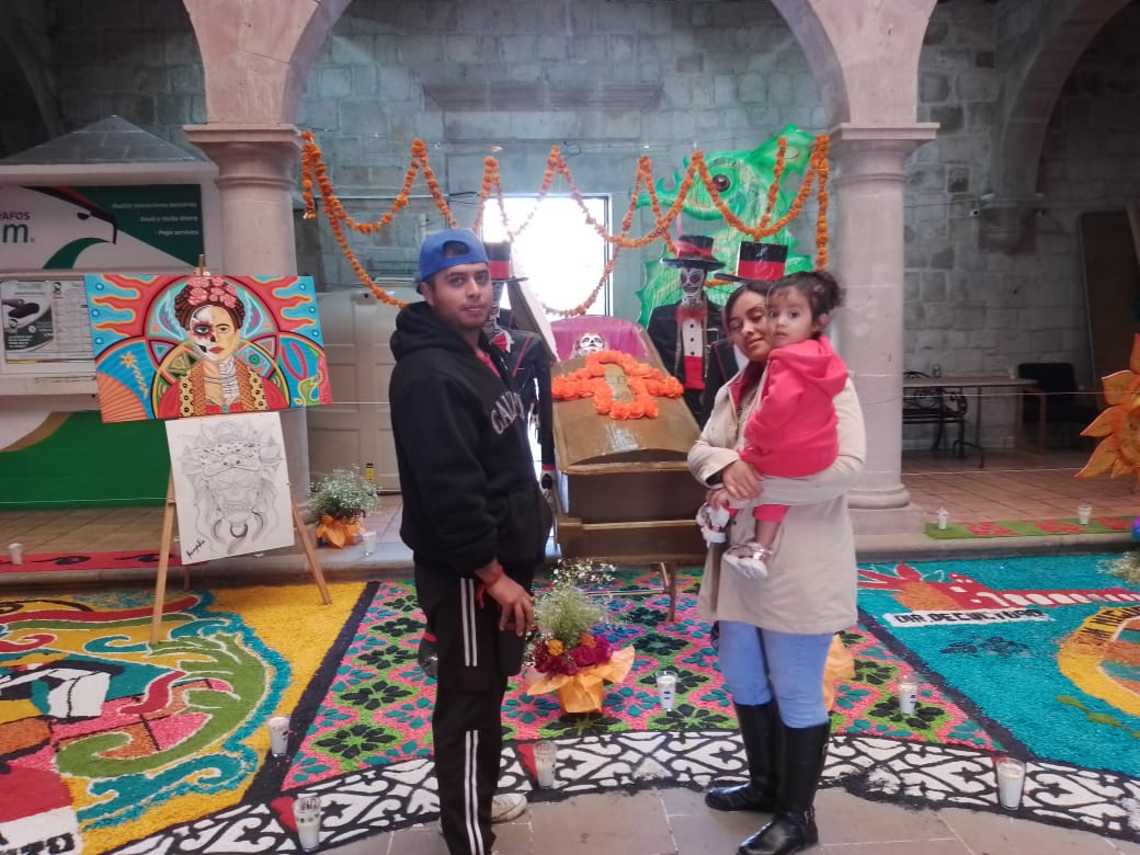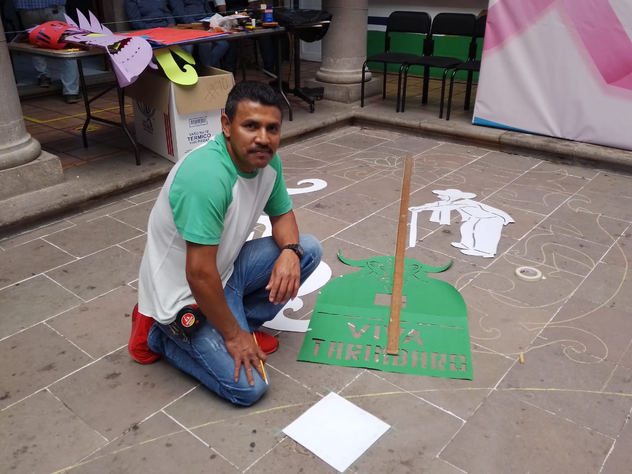 Con el apoyo de más de diez personas que trabajaron desde las 08:00 de la mañana, sin tener hora para descansar, por más de una semana se llevaron a cabo los trabajos de elaboración del altar y tapete de muertos que se exhibe en el patio principal del ayuntamiento de Tarímbaro, todo bajo la dirección y coordinación del artista Sergio Pérez Reyes.