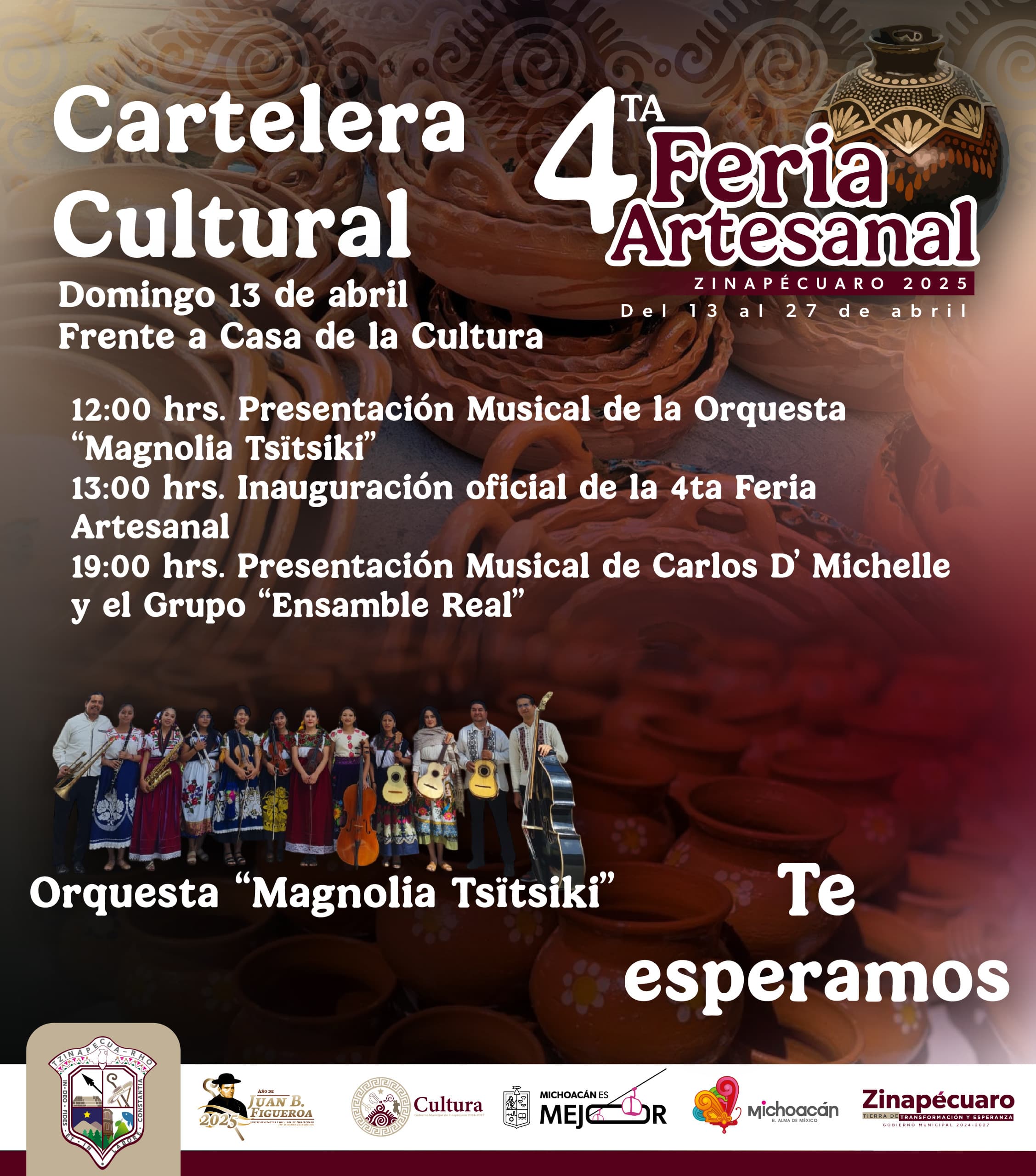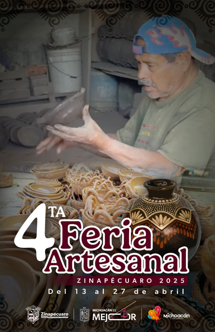 En el marco de las festividades de la Semana Santa, el Gobierno Municipal de Zinapécuaro encabezado por Jordan Reyes García, invita al público en general a la inauguración de lo que será la 4ta Feria Artesanal Zinapécuaro 2025.